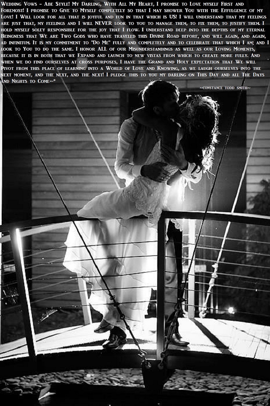 ~Wedding Vows – Abe Style~ April 30, 2013April 30, 2013 Share this:Tweet Click to email a link to a friend (Opens in new window) Email Click to print (Opens in new window) Print Like Loading... Related Posted by Constance Todd Smith Categories Appreciation Emotional Guidance System Law of Attraction Love Love Loving You RelationshipsTags Abraham-Hicks; Law of Attraction; Emotional Guidance System; LoveLoving loving you; eternalRelationshipswedding vows